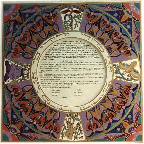 | An eclectic combination of Eastern and Jewish symbols. This Ketuba is circular to symbolize the eternity of love between the bride and groom. The gold highlights are reminiscent of the wedding ring while the border of lotus blossoms is a blessing to the bride and groom. |
